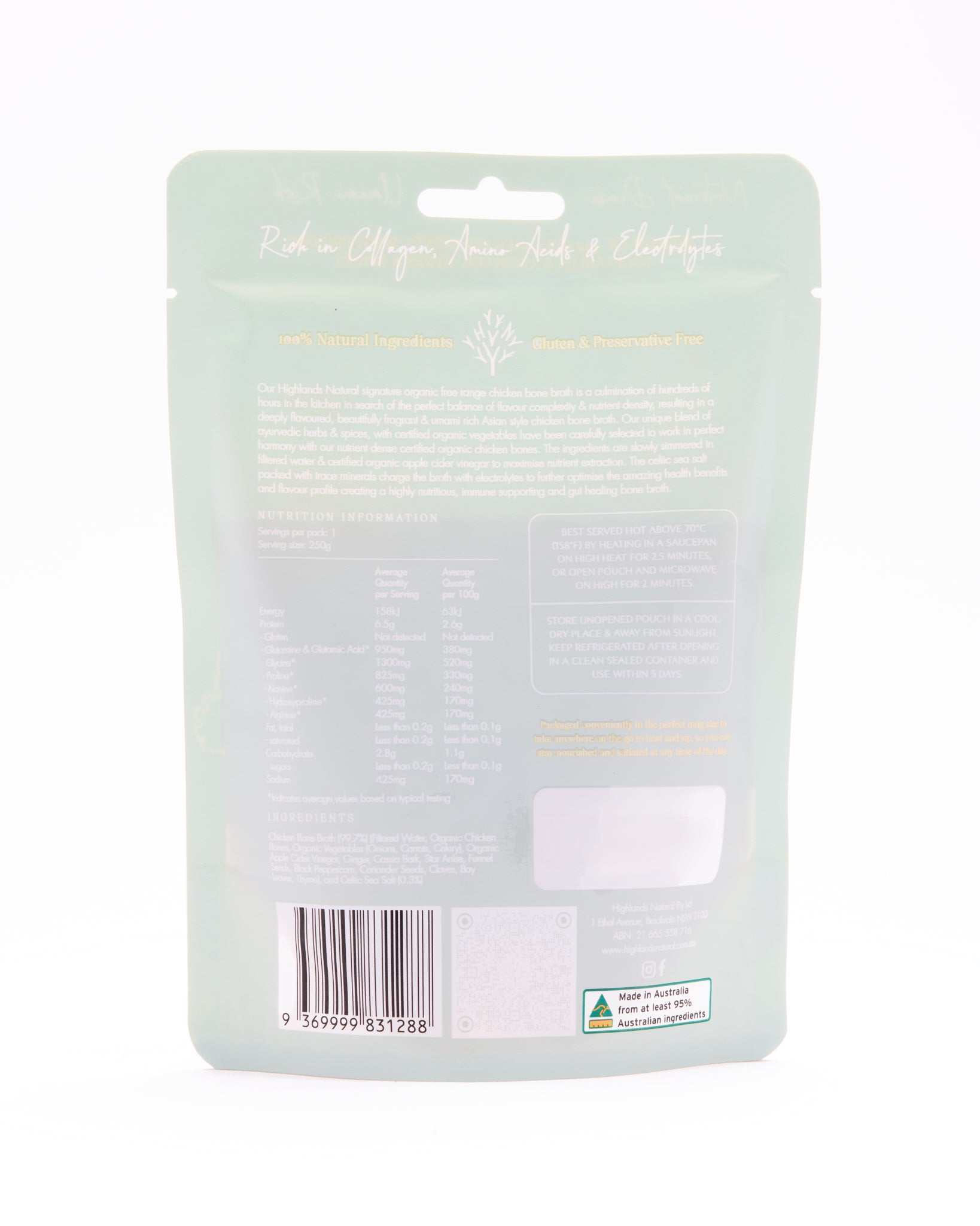 Our Highlands Natural signature organic free range chicken bone broth is a culmination of hundreds of hours in the kitchen in search of the perfect balance of flavour complexity & nutrient density, resulting in a deeply flavoured, beautifully fragrant & umami rich Asian style beef bone broth. Our unique blend of ayurvedic herbs & spices, with certified organic vegetables have been carefully selected to work in perfect harmony with our nutrient dense certified organic chicken bones. The ingredients are slowly simmered in filtered water & certified organic apple cider vinegar to maximise nutrient extraction. The celtic sea salt packed with trace minerals charge the broth with electrolytes to further optimise the amazing health benefits and flavour profile creating a highly nutritious, immune supporting and gut healing bone broth.