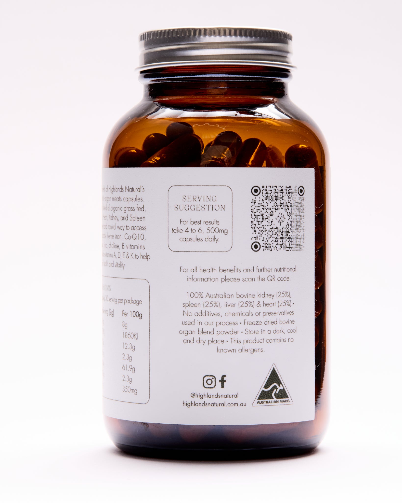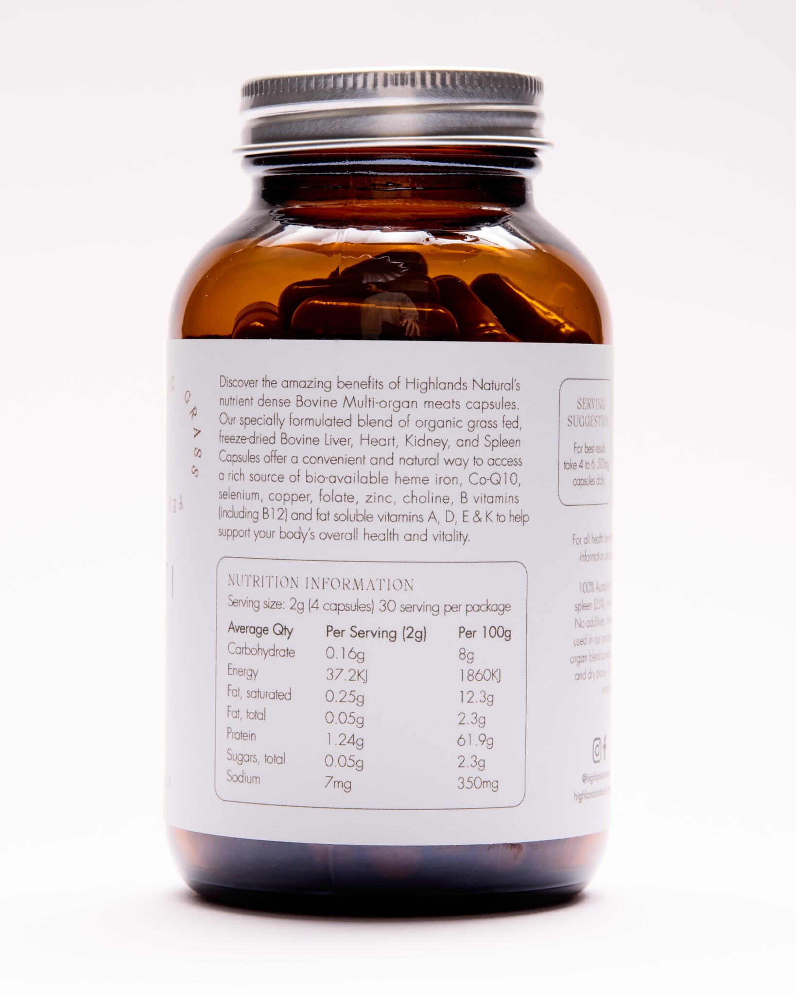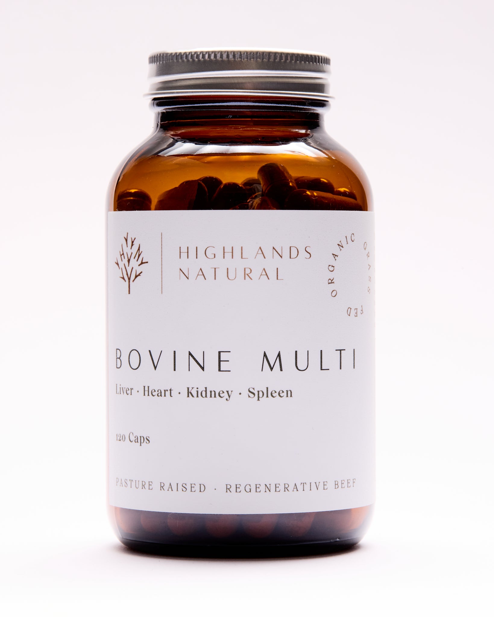 Discover the amazing benefits of Highlands Natural’s nutrient dense Bovine Multi-organ meats capsules. Our specially formulated blend of organic grass fed, freeze-dried Bovine Liver, Heart, Kidney, and Spleen Capsules offer a convenient and natural way to access a rich source of bio-available heme iron, Co-Q10, selenium, copper, folate, zinc, choline, B vitamins (including B12) and fat soluble vitamins A, D, E & K to help support your body’s overall health, immunity and vitality.